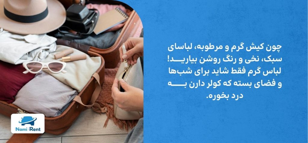 به دلیل آب‌وهوای گرم و مرطوب جزیره، محتوای چمدان شما باید خاص باشد. در فصول گرم، تمرکز بر لباس‌های نخی، سبک و رنگ روشن است که به گردش هوا کمک می‌کند. حتی در فصول معتدل، لباس‌های گرم تنها برای شب‌ها و فضای بسته (به دلیل استفاده از تهویه) مورد نیاز است. مهم‌ترین اقلام، کرم ضد آفتاب با فاکتور محافظتی (SPF) بالا، عینک آفتابی استاندارد و کلاه لبه‌دار برای محافظت حداکثری در برابر آفتاب تند است. اگر قصد استفاده از پلاژهای بانوان یا آقایان را دارید، لوازم شنا (مایو، حوله و دمپایی ساحلی) را فراموش نکنید. همچنین به یاد داشته باشید که آب لوله‌کشی کیش قابل آشامیدن نیست و باید آب معدنی تهیه کنید.